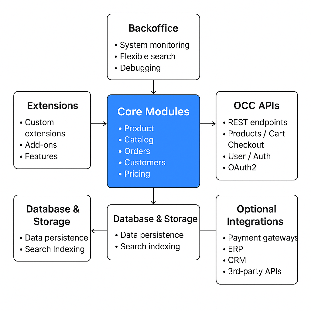 - OCC APIs: RESTful APIs for headless integration with frontend or mobile apps.